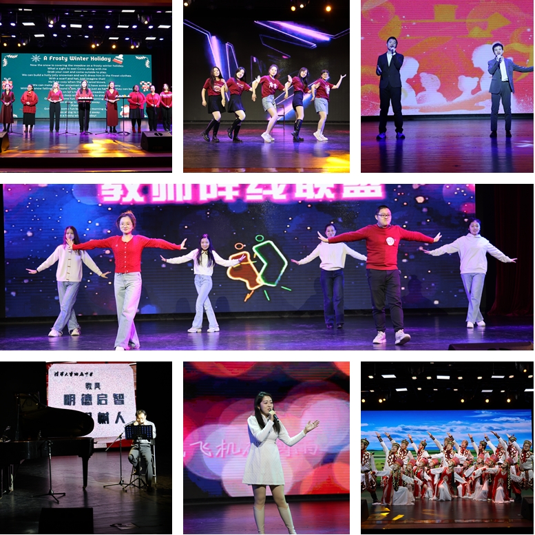演出节目精彩纷呈。国际部的老师为大家带来歌曲《新年合唱》。大家在歌声中,用爱传递温暖,用旋律编织梦想。工间操协会的老师们为大家带来舞蹈《新年艺起嗨》,在热烈欢快的音乐中充分展示新时代教师的活力与朝气。数学组的陈昱嘉和闫志存带来歌曲对唱《把故事写成我们》,带领大家穿越时光长廊,回想过往难忘瞬间,感受属于每一个人的温暖与感动。教工团老师们带来舞蹈《教师阵线联盟》。讲台上他们一丝不苟,认真严谨;工作之余他们活泼可爱,热爱运动。他们既是年轻的教师,也是热情的青年人,永葆青春,奋斗不止。语文组向东佳老师带来口琴串烧,由王金锋老师伴奏,带我们一起去《成都》的街头走一走,一起感受《一生所爱》传递出的对学校的深情。英语组刘舒畅老师为大家带来一曲《那些你很冒险的梦》,鼓励老师们树立梦想,勇敢前行,照亮前行之路。教师舞蹈团倾情演绎舞蹈《鄂尔多斯》,带领大家走进辽阔壮美的内蒙古大草原,走进那片充满神秘与魅力的土地——鄂尔多斯。